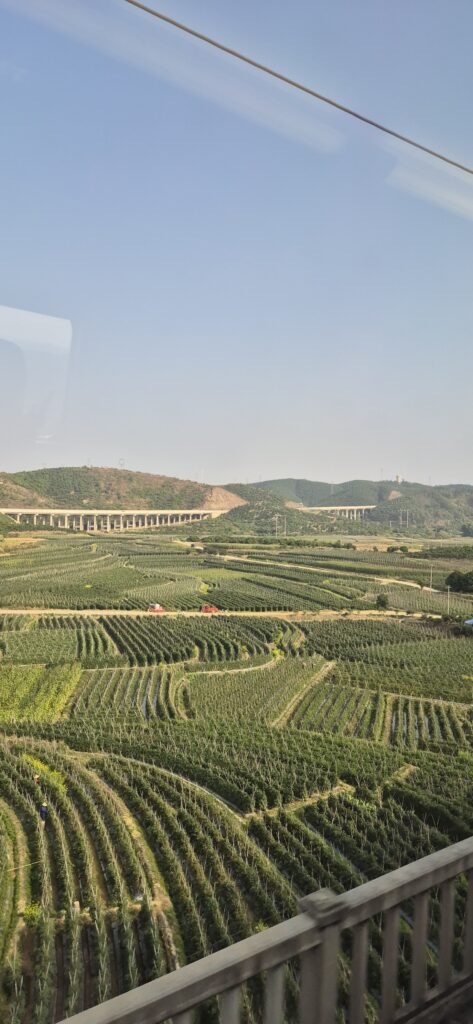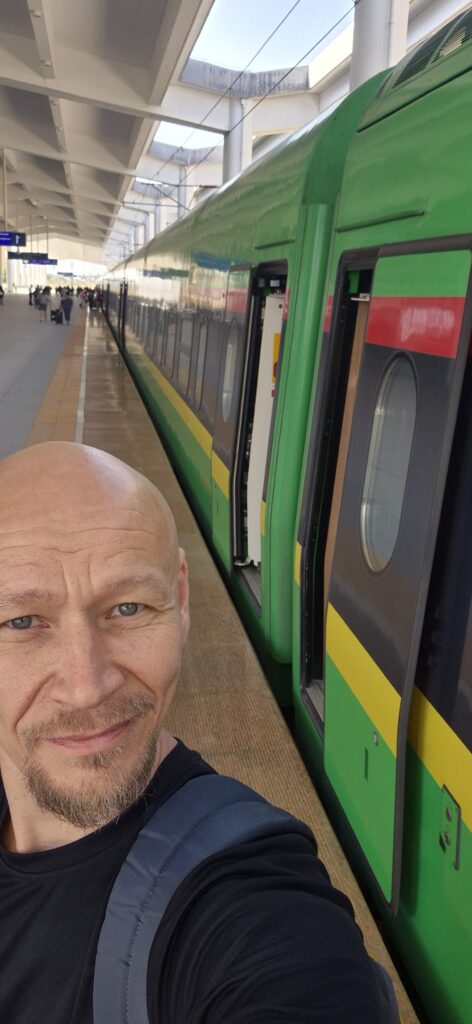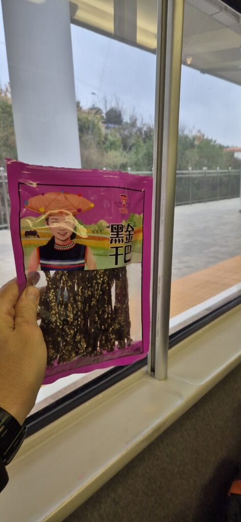 Junamatka itsessään kului leppoisasti ikkunasta maisemia katsellen ja kuivalihaa imeskellen. Sangen suppea valikoima ravintolavaunussa. Juna oli pikajuna, mutta ei nopein malli ja keräsi vauhtia 250 km/h. Matka Vientianesta Kunmingiin kesti koko päivän. Oltiin illalla perillä. Taisi kestää n. 10 h. Yövyttiin aseman lähellä hotellissa. Laosista ostetut kärryt kestivät tähän asti, mutta nyt renkaat lähtivät eri suuntiin. Ostettiin lennosta ensimmäiset vastaan tulleet kiinalaiset versiot, jotka palvelivatkin sitten loppuun asti. Aamulla jatkettiin junalla Kunmingistä läheiselle asemalle Kunming Naniin, josta hypättiin toiseen junaan, joka suuntasi Jiangmeniin. Sisämaasta lähemmäs merenrantaa. Välimatkat olivat pitkiä. Matka kesti taas koko päivän.