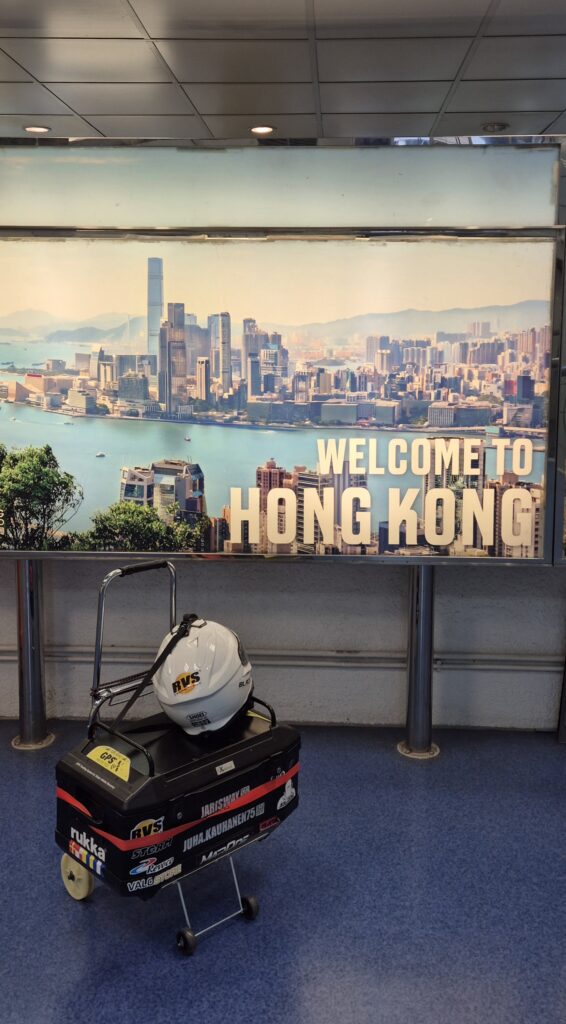 Saimme tavaratelineet ja ajopuvut ängettyä boksin sisään, kypärän joutui sitomaan ulkopuolelle. Löysimme paikallisesta marketista kärryt, joilla oli kätevä vetää nyt jo n. 30 kg Hepco & Beckerin varustebokseja perässä.