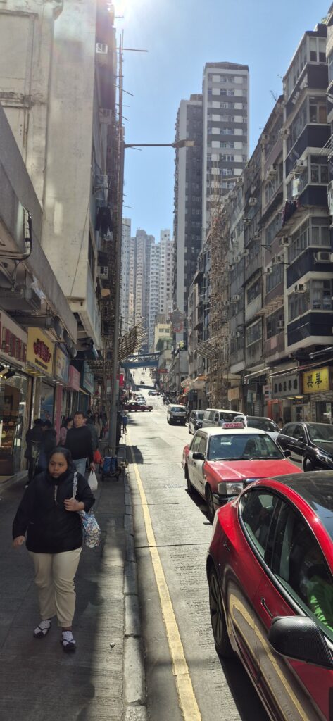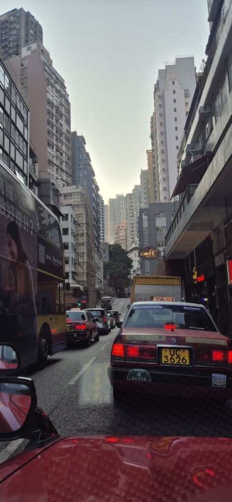 Macaosta oli parin tunnin lauttamatka Kiinan toiseen erityishallintoalueeseen Hong Kongiin, joka oli myös käymisen arvoinen paikka. Yksi maailman tiheimmin asutuista alueista niin kuin Macaokin, toinen toistaan korkeampia pilvenpiirtäjiä kylki kyljessä. Kummallakin alueella vielä omat valuuttansa. Kaupunki oli siisti ja hyvin huoliteltu ainakin paremmilla alueilla. Katukuvassa oli havaittavissa hyvin pukeutuneita menestyjiä luxusluokan ajoneuvoineen. Olimmehan yhdessä maailman talouden tärkeimmässä keskuksessa. Mutta suurin ihmettelyn aiheemme oli kuitenkin kaupungin taksit. Suurin osa 80-luvulta jääneitä Toyotan Crowneja.