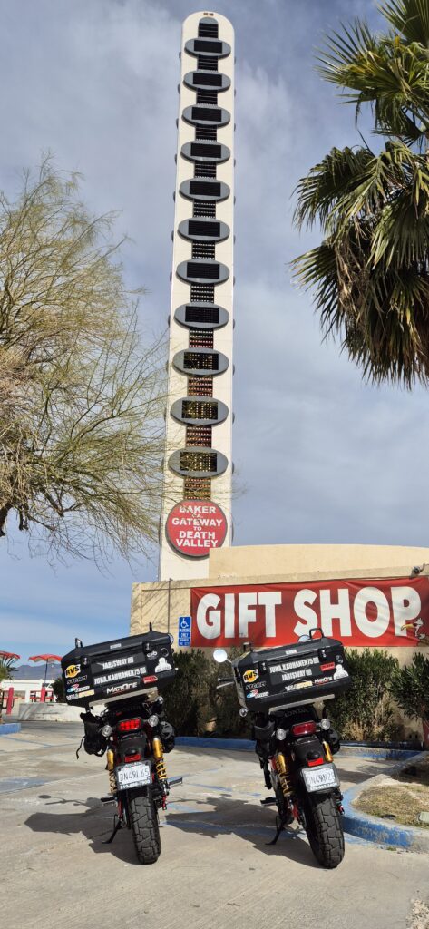 Los Angelesin ja Kalifornian jälkeen suuntana oli Nevada ja siellä tietenkin Las Vegas. Tälle välille matkaa kertyi n. 310 mailia (500 km). Suuri osa, tai oikeastaan koko matka, oli autiomaata. Pitkiä, siis tooodella pitkiä suoria teitä. Reitimme kulki Mojaven autiomaan reunaa. Noin sadan kilometrin välein oli pieniä puoliksi hylättyjä kyläpahasia, joissa onneksi aina oli se yksi huoltoasema jossa saatiin tankattua ja kaffet. Jos yhdenkin huoltiksen olisi missannut niin seuraavalle ei olisi riittänyt. Mankin tankillisella ajoi sen max. 130-150 km meidän kuormalla ja tuulen suunnasta riippuen. Siltä varalta mukana kulki sivulaukussa litran varabensapullo. Se todettiin ihan tarpeelliseksi muutamaankin kertaan.