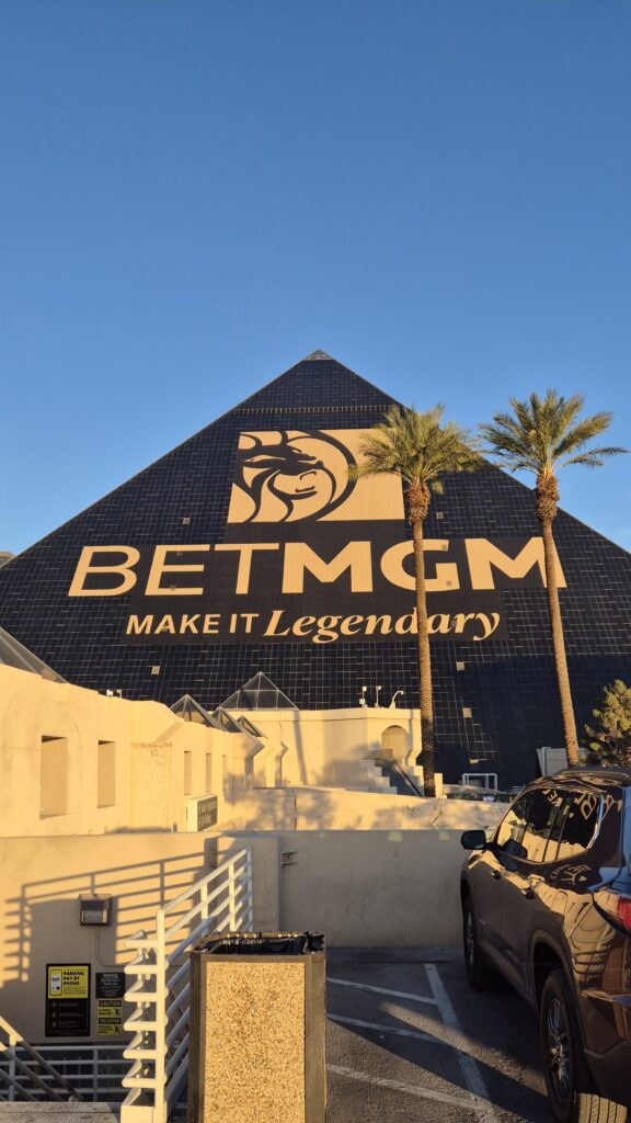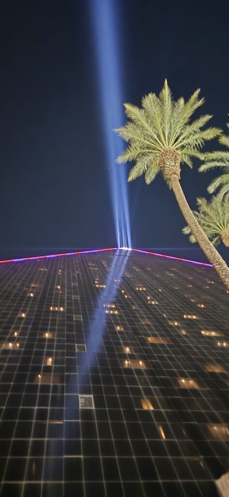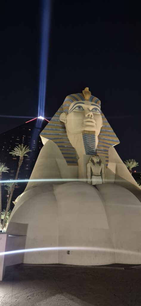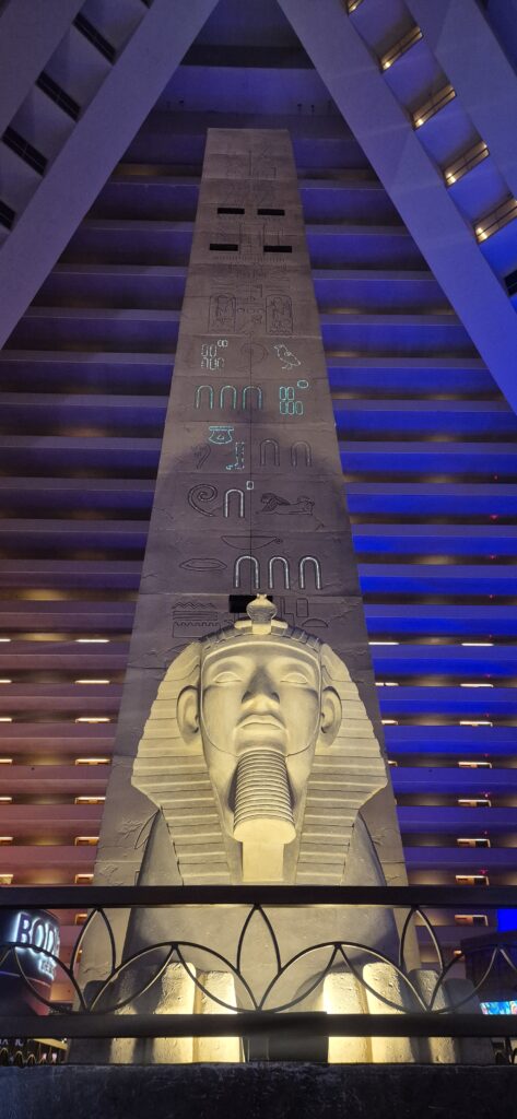 Me majoituimme kaupungin muusta arkkitehtuurista poikkeavaan ikoniseen kasinohotelli Luxoriin. Tämä egyptiläisteemainen, 30-kerroksinen pyramidihotelli sisälsi yli 4000 huonetta ja valtavan sisääntuloatriumin, joka kohosi yli sataan metriin. Vaikuttavaa. Se on tunnettu myös pyramidin kärjessä öisin hohtavasta valokeilasta ja iltaisin esitettävästä Blue Man Groupin showstaan. Luulisi myös yöpymisen hintojen olevan pilvissä Vegasin prameissa hotelleissa, mutta näinhän se ei ole. Yleinen huoneiden hintataso oli todella halpaa koska pelaajia tarvitaan paljon ja raha tulee kasinoilta. Meillä huone maksoi Luxorissa 70 euroa/yö. Voi sanoa, että hinta laatusuhde kohdallaan. Vaikkakin hieman jo aikaa nähnyt, vanha luxusluokan hotelli.