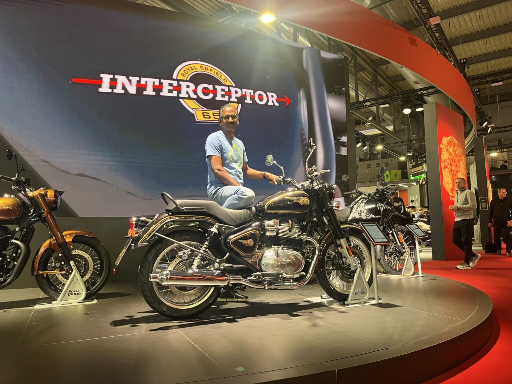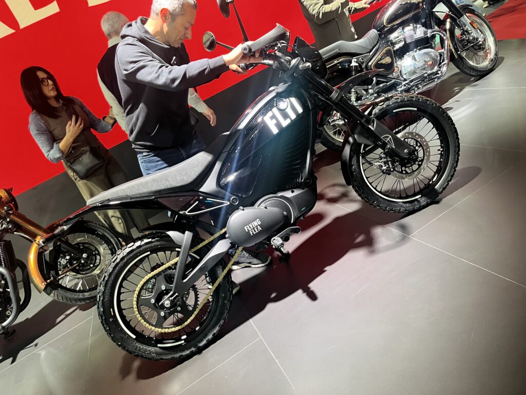 Royal Enfieldin osastolla komeili juhlan kunniaksi kopio valmistajan ensimmäisestä moottoripyörästä osoittaen merkin sitoutumista omiin perinteisiinsä. Toisaalta Royal Enfieldillä katsotaan myös tulevaisuuteen Flying Flea -sähköbrändillä.