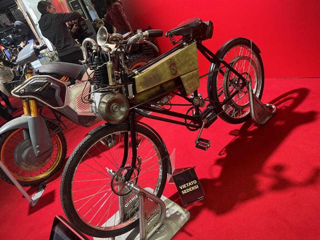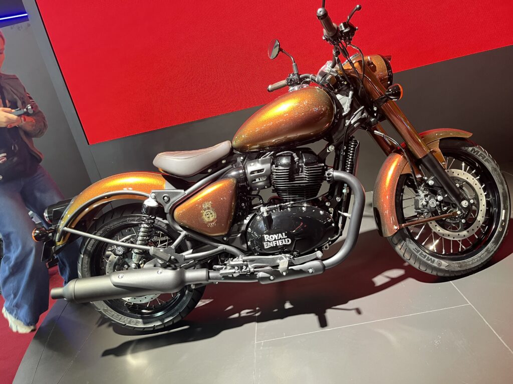 Royal Enfieldin osastolla komeili juhlan kunniaksi kopio valmistajan ensimmäisestä moottoripyörästä osoittaen merkin sitoutumista omiin perinteisiinsä. Toisaalta Royal Enfieldillä katsotaan myös tulevaisuuteen Flying Flea -sähköbrändillä.